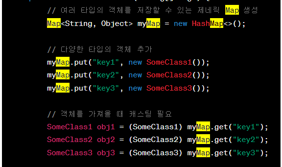 Map을 사용해 서로다른 클래스들을 Object 형식으로 저장하고, 나중에 꺼내 쓸 때 각자의 클래스 형태로 다시 캐스팅해서 사용하는 방법을 배웠다.